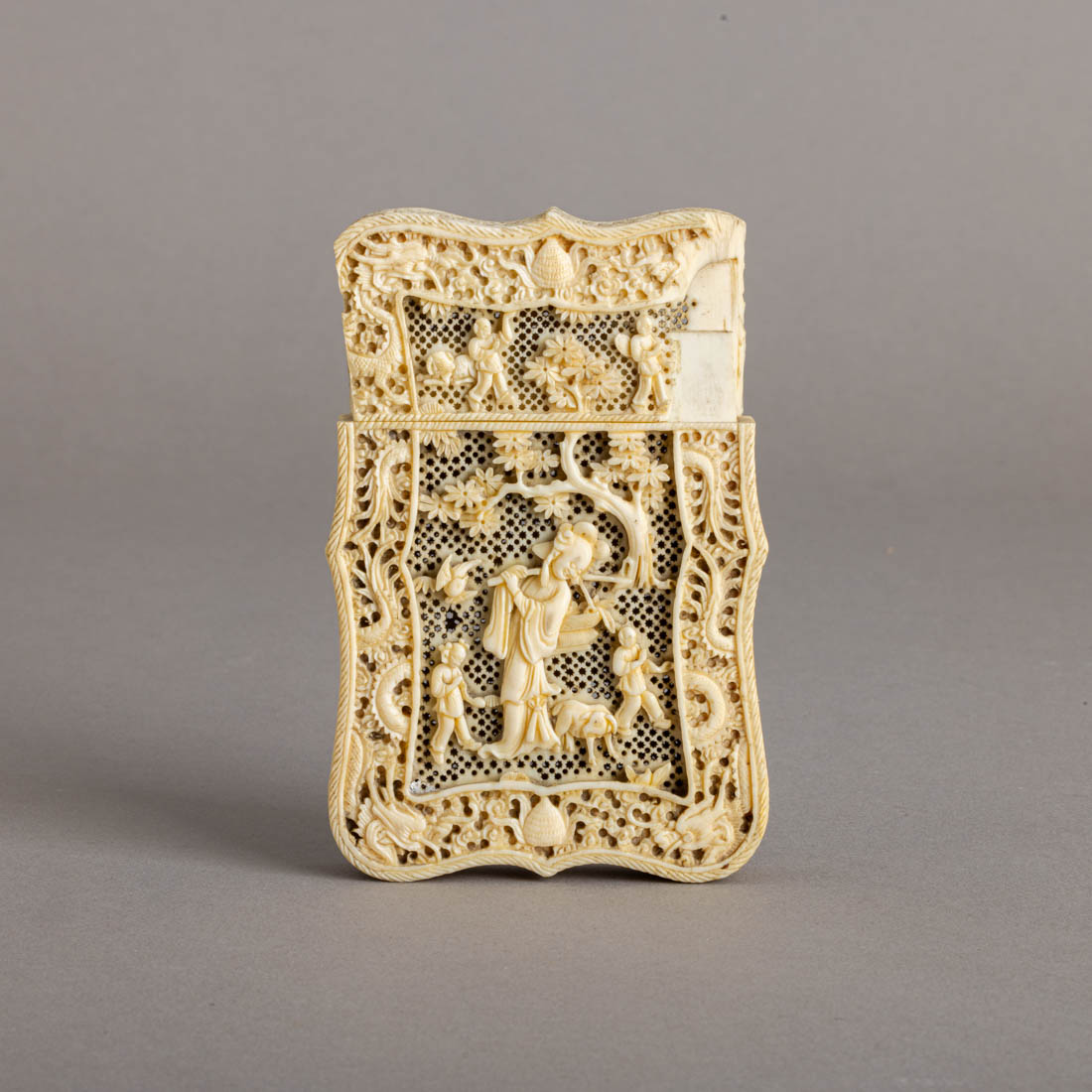 Em marfim minuciosamente esculpido, decoração relevada e vazada com figuras e dragões. China, Séc. XIX/XX. Falhas e defeitos.