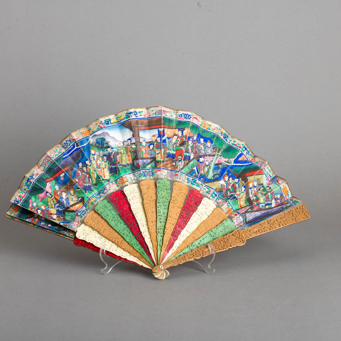 Varetas em xarão lacado a negro com dourados "jardim com figuras", aba em papel pintado e dourado "Paisagem com figuras em cenas do quotidiano" aplicações em osso. China, Séc. XIX/XX. Pequenos defeitos.