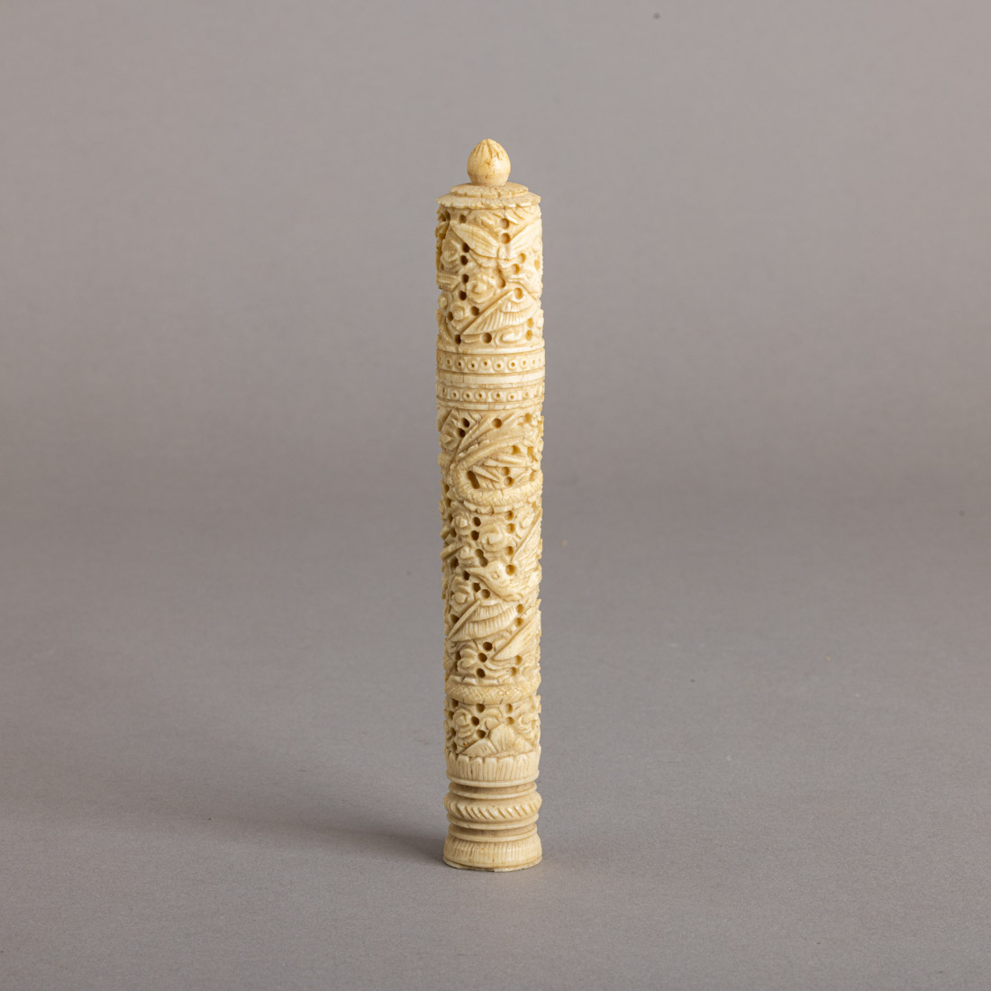 Em marfim minuciosamente esculpido, decoração relevada e vazada com pássaros e dragões. No interior diversas agulhas. China, Séc. XIX/XX. Sinais de uso, pequenas falhas.