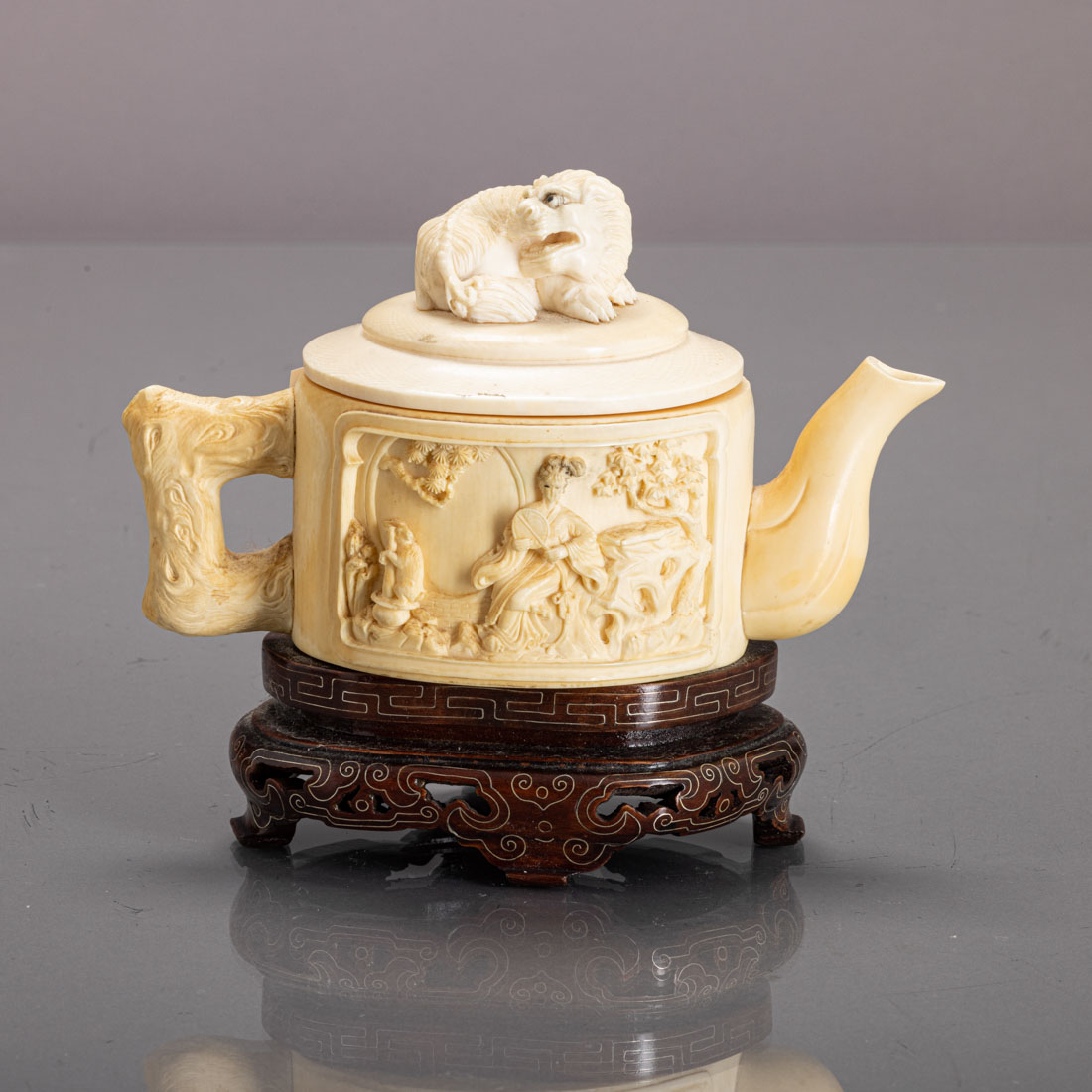 Esculpido em marfim, decoração relevada "cenas de exterior", pomo da tampa na forma de cão de foo. Base em madeira entalhada. China, Séc. XX. Sinais de uso.