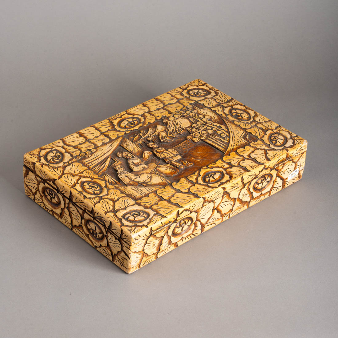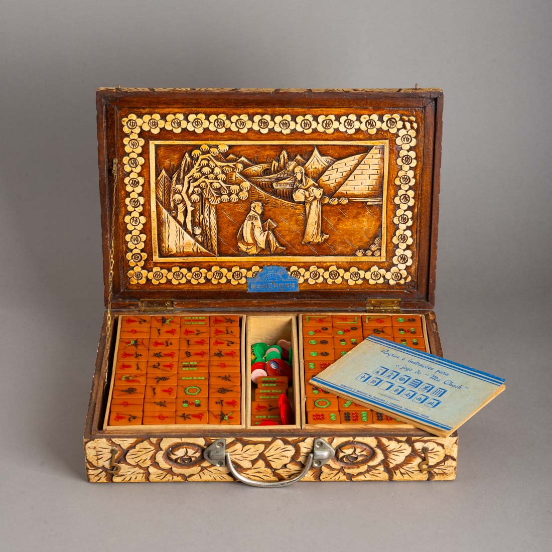 Estojo em canfora com entalhamentos "paisagem com figuras", peças em baquelite. Oriental. Sinais de uso. Sinais de uso.