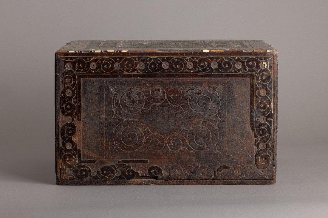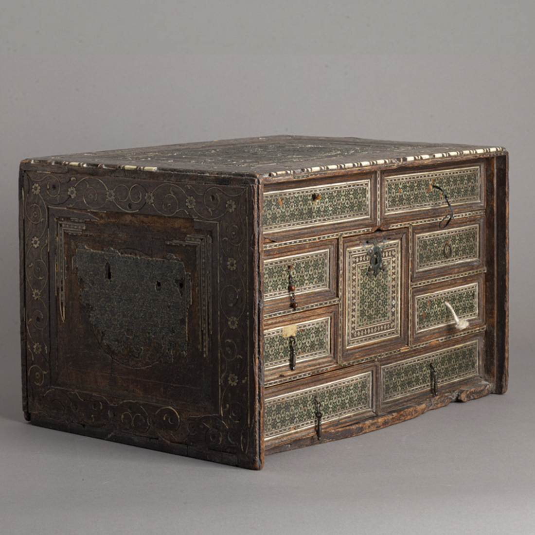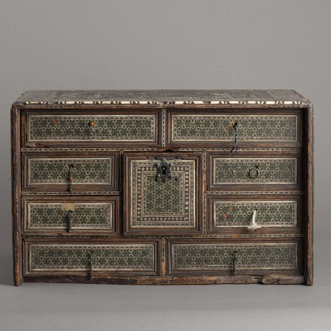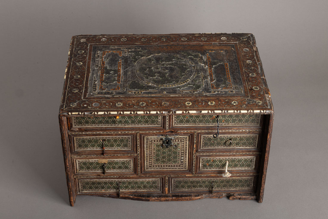 Em teca e sissó, com embutidos micromosaico "sadeli", interior com oito gavetas simulando nove. Séc. XVII(1ª metade). Vertente de influência Mogol. Falta tampa, falhas e defeitos.