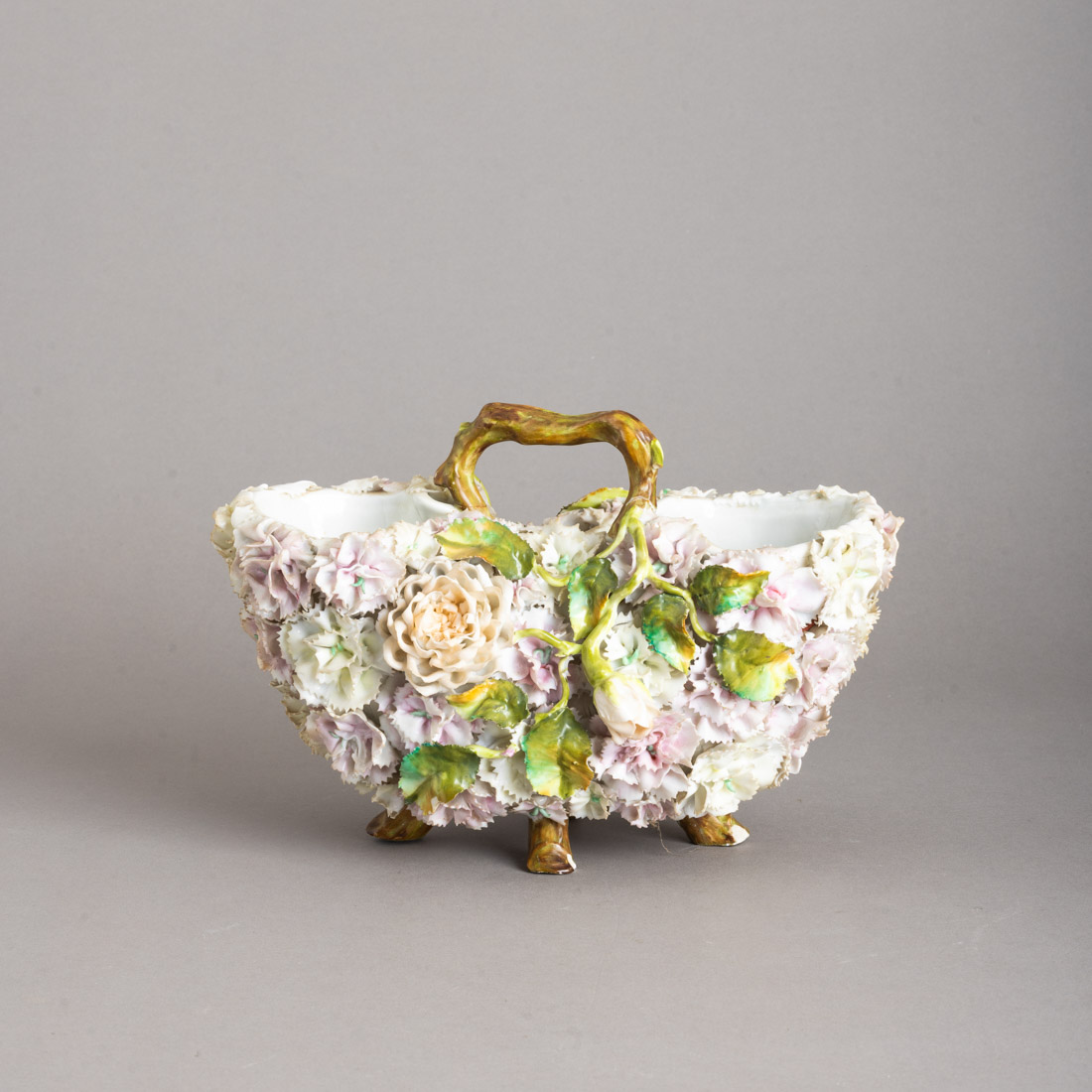 Em porcelana, decoração policromada com flores em relevo. Europeia. Pega colada e falhas.