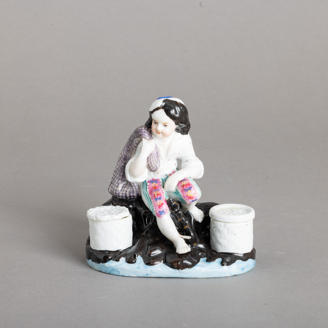 Escultura em porcelana, decoração policromada. Sinais de uso e falha na âncora.