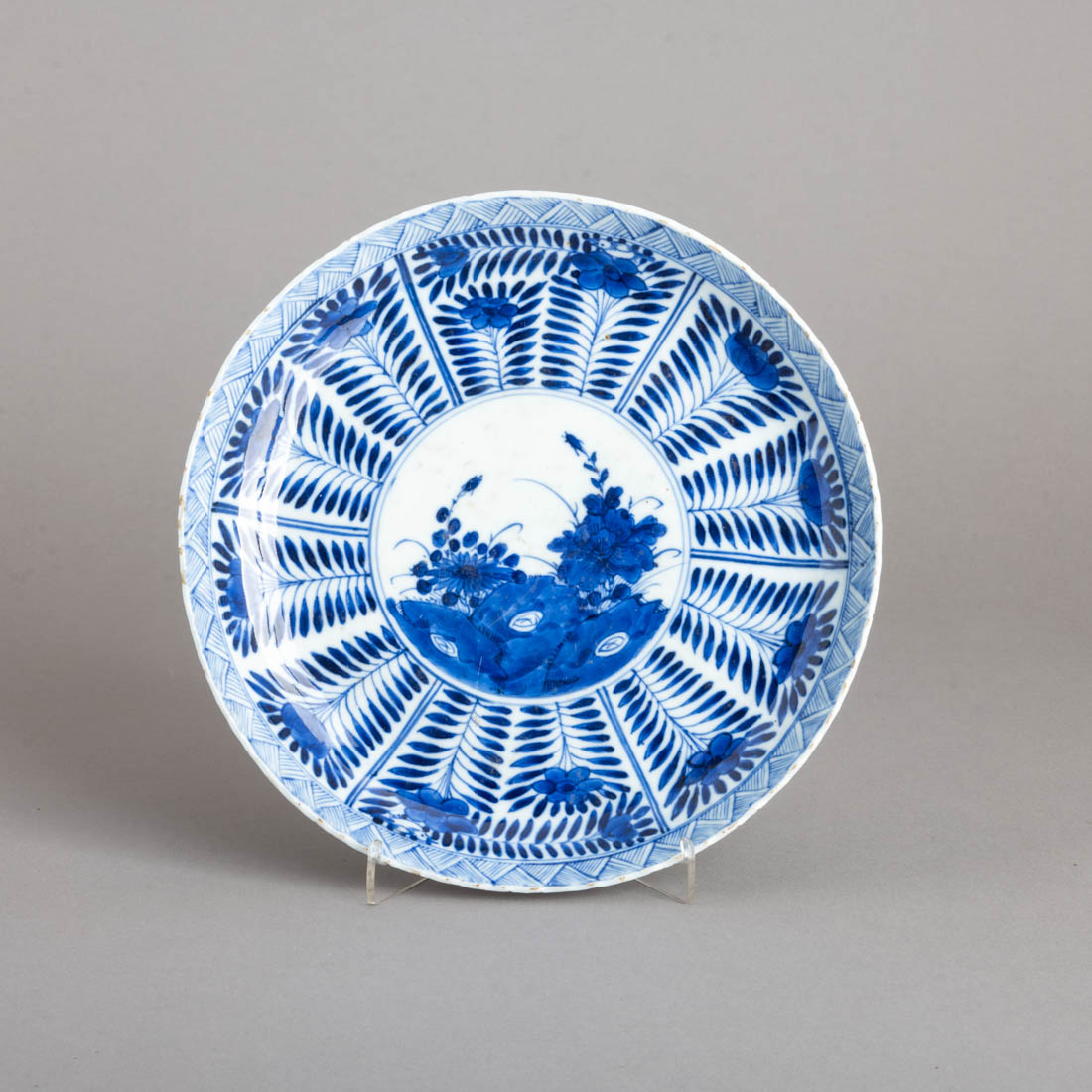 Em porcelana da China, decoração a azul "flores". Marcado. Sinais de uso e esbeiçadelas.
