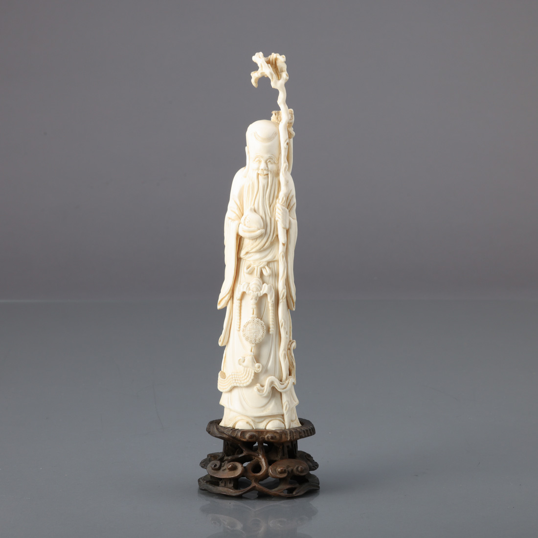 Escultura em marfim, base em madeira entalhada. China, Séc. XX (meados). Falhas no cajado.