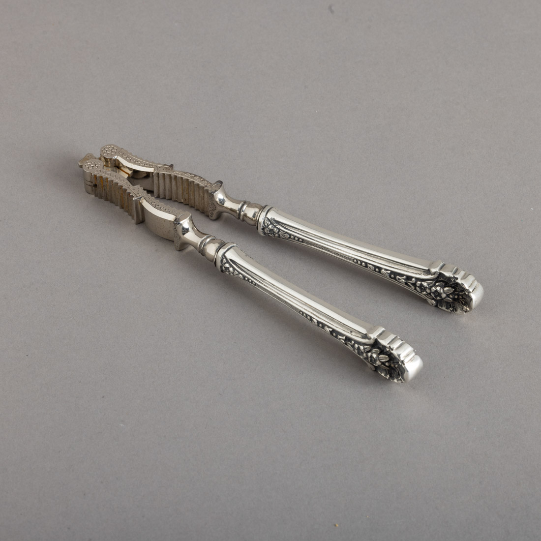 Com cabos em prata portuguesa contraste águia (1938-1984) de 833, decoração relevada "flores". Sinais de uso.