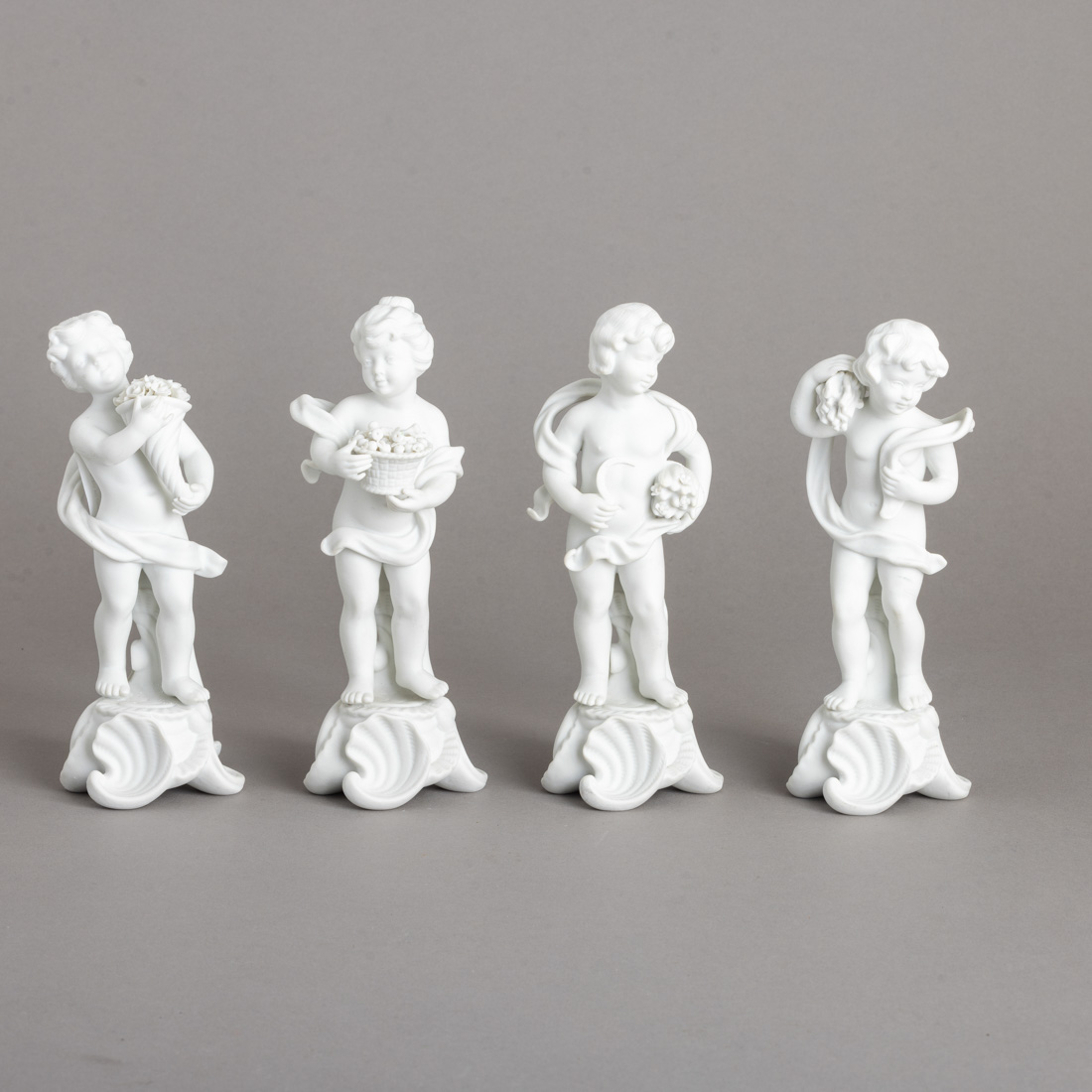 Esculturas em biscuit moldado (1968-1971/1980), decoração monocroma a branco. Ínfimas falhas nas flores.