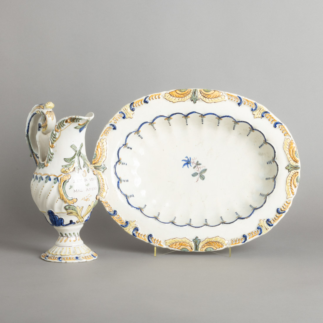 Em faiança portuguesa da Fábrica do Carvalhinho, assinada Carlos Branco, decoração relevada e policromada, gomil com inscrição "Lenha Verde Mal Acende". Séc. XX (inícios). Sinais de uso, pequenos cabelos e lavanda com esbeiçadela e bico colado. Dim.: 8,5x39x30,5 e 29 cm.