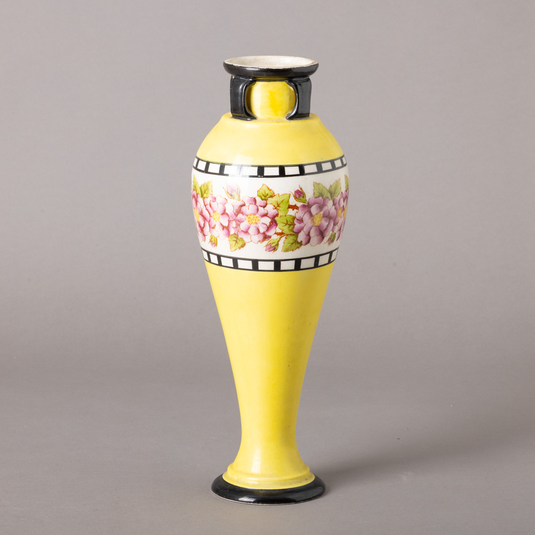 Em loiça pó de pedra fabrico de Sacavém, decoração policromada "flores" sobre fundo amarelo. Marcada. Sinais de uso, craquelê e esbeiçadela na base.