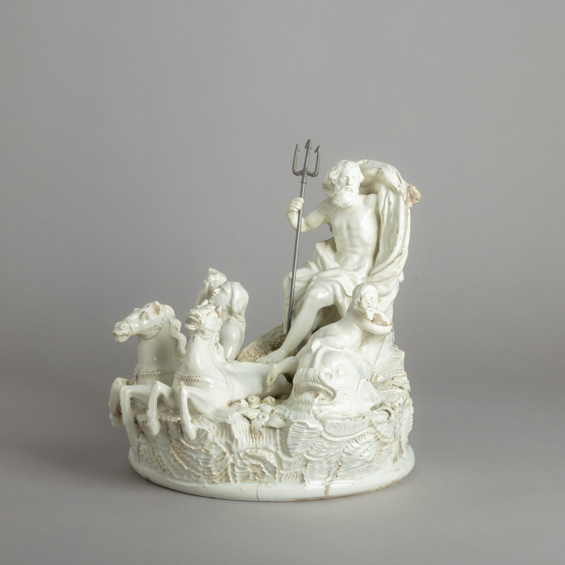 Em faiança, representando o Deus Neptuno no seu carro em forma de concha, rodeado por diversas figuras mitológicas associadas ao mar, último quartel do Séc. XVIII. Tridente posterior. Falhas e defeitos.