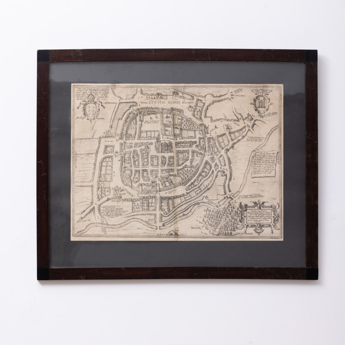 Litografia a negro sobre papel, publicada na obra "Civitates Orbis Terrarum", Colónia, 1572-1618, 6 vols. Georg Braun (1541-1622). Picos de acidez e ligeira mancha na dobra central.