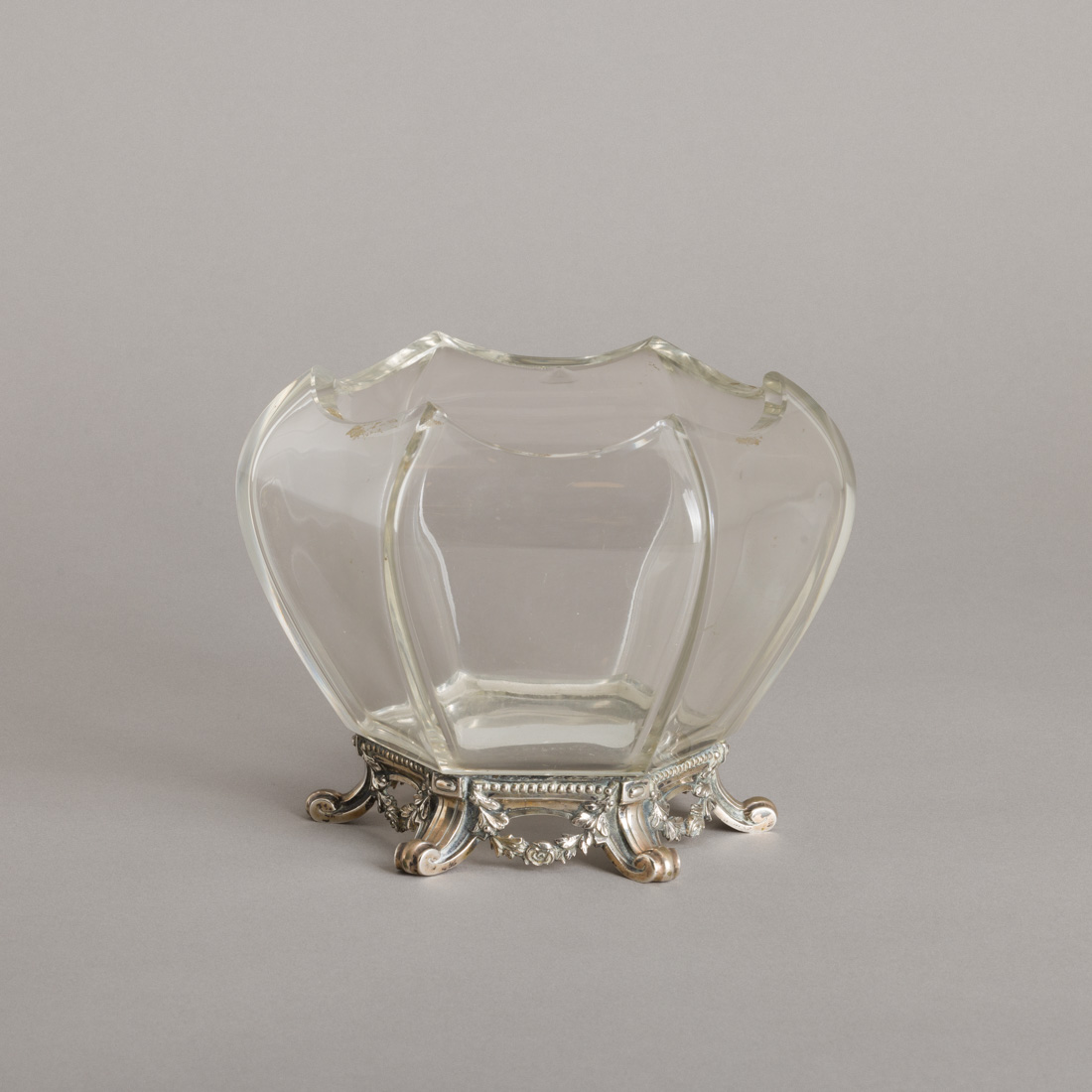 Em vidro com base em prata portuguesa contraste javali (1887-1937) de 833, decoração relevada e vazada "grinaldas" Sinais de uso e esbeiçadelas.