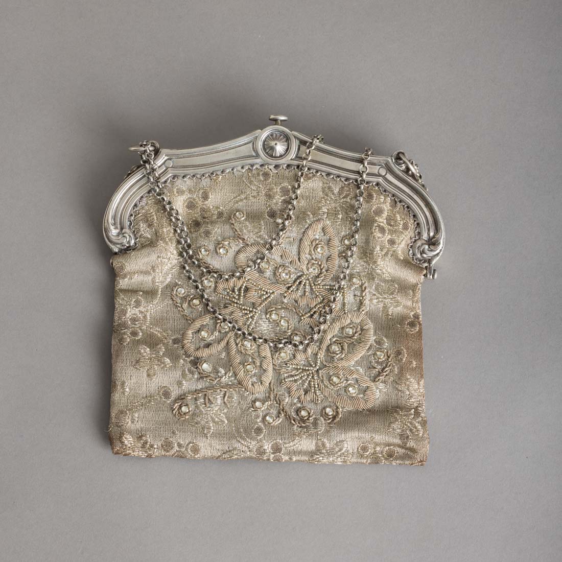 Em prata francesa de 800, marcas de garantia de teor decoração relevada e tecido em fio prateado bordado. Sinais de uso e pequenos defeitos.