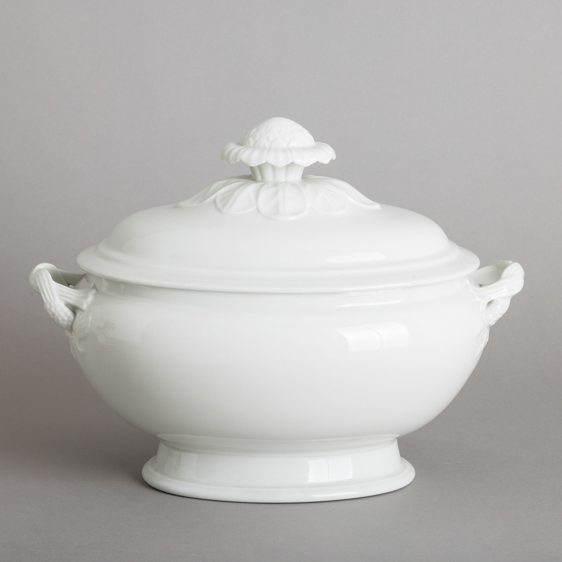 Em porcelana moldada e relevada (1947-1968), decoração monocromada a branco. Sinais de uso.