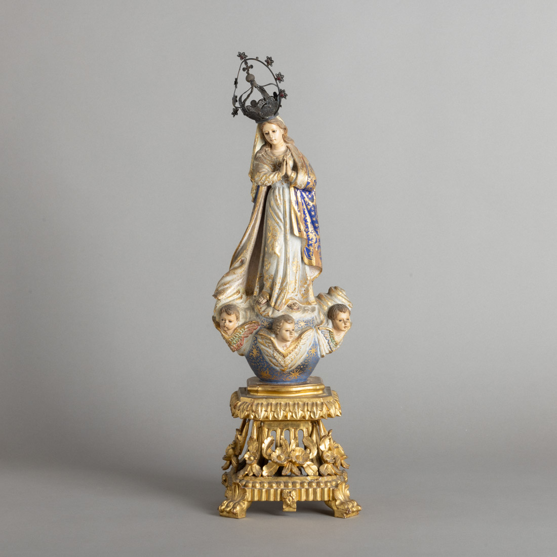 Escultura em madeira policromada e dourada, olhos de vidro representada sobre globo com nuvem e cabeças de anjo assente em peanha entalhada e dourada. Séc. XIX. Coroa em filigrana de prata. Pequenas falhas e ligeiros defeitos.