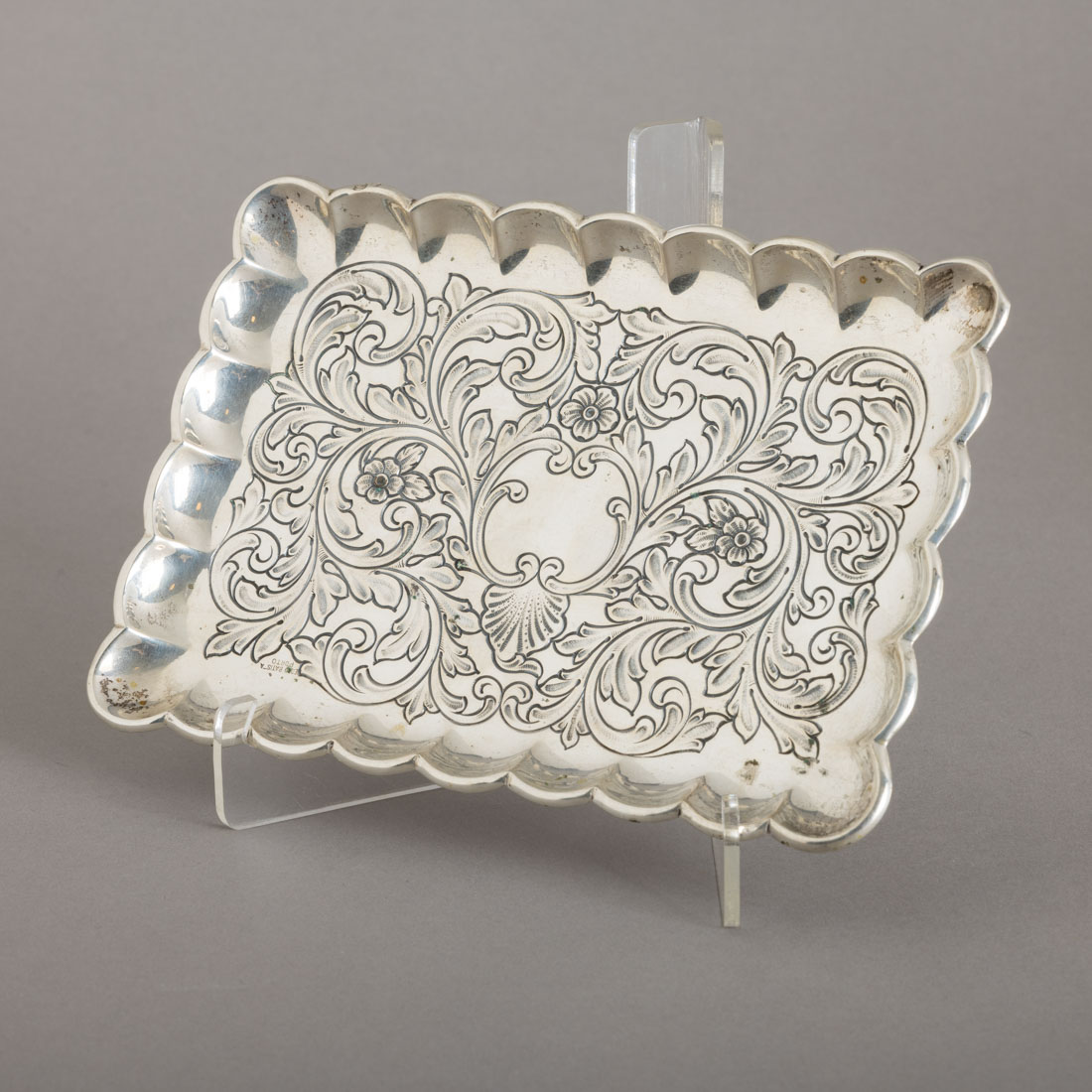 Em prata portuguesa contraste águia (1938-1984) de 833, decoração gravada "elementos vegetalistas", bordo gomado. Sinais de uso e leves amolgadelas.