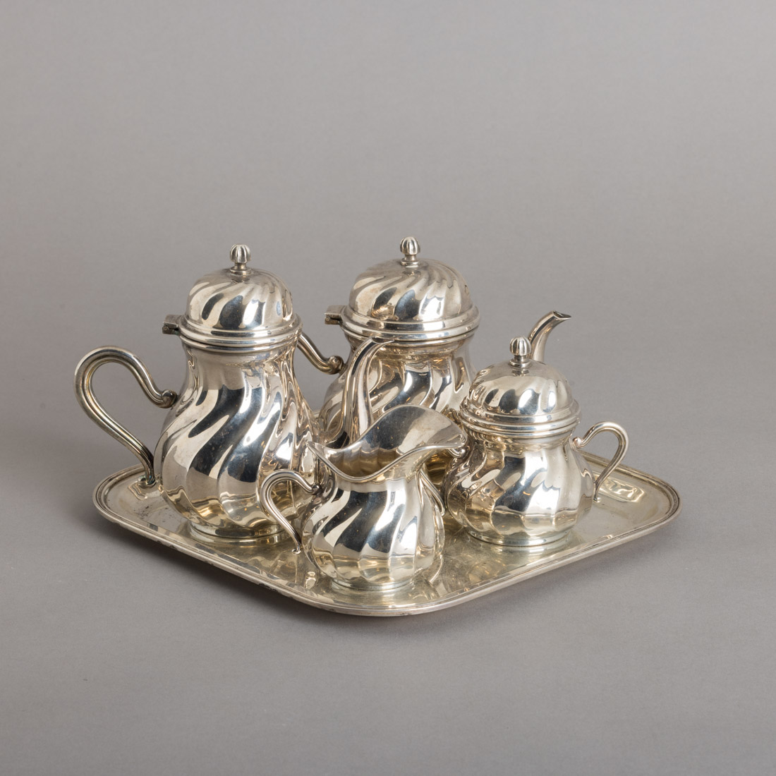Em prata portuguesa contraste águia (pós 1985) de 925, decoração espiralada, bandeja lisa. Composto por bule, cafeteira, açucareiro, leiteira e bandeja. Sinais de uso e bandeja com leves pontos de oxidação.