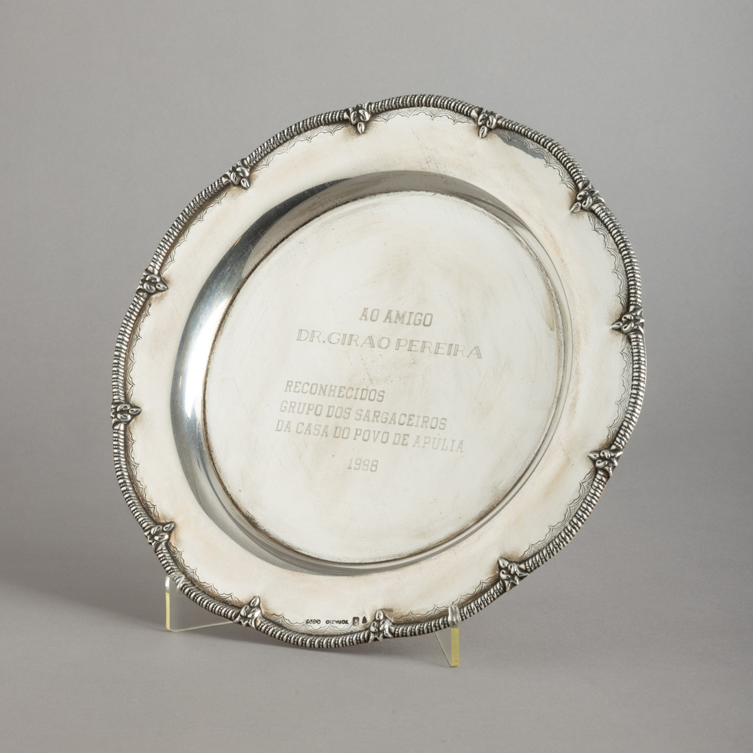 Em prata portuguesa contraste águia (pós 1985) de 925 marcada Topázio, bordo gravado, recortado e relevado. Com dedicatória gravada. Sinais de uso.