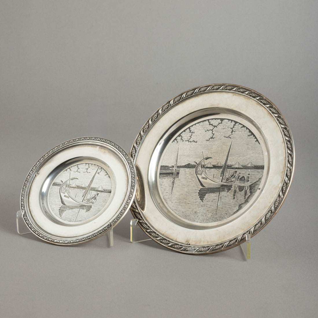 Em prata portuguesa contraste águia (pós 1985) de 835, decoração gravada "paisagem com salinas e moliceiro", bordo relevado. Uma com dedicatória gravada no verso. Sinais de uso.