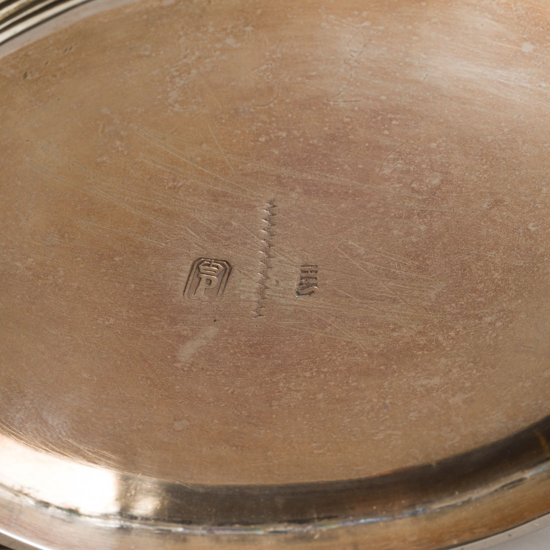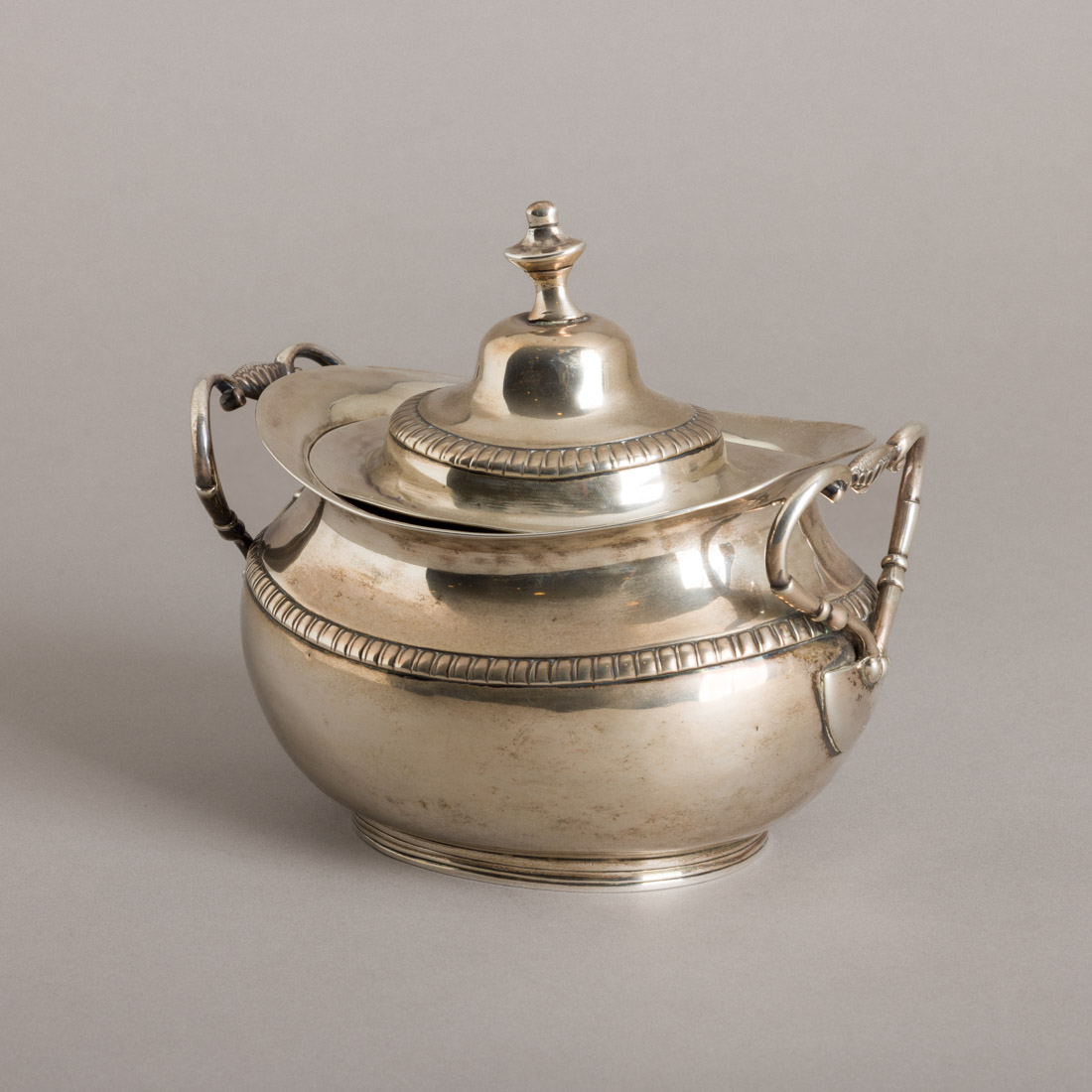 Estilo D. Maria, em prata portuguesa do Séc. XIX, marca de ensaiador do Porto (P-33) datável de 1836-1843 e de ourives (P-341) datável de 1843-1853, decoração lisa com frisos em relevados. Sinais de uso e tampa amolgada. Peso aprox.: 494 g. Dim.: 15 cm.