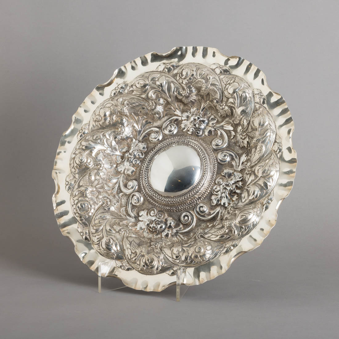 Em prata portuguesa contraste javali (1887-1937) de 916 - 1º título, marcada, decoração relevada e repuxada "mascarões, flores e pássaros". Sinais de uso.