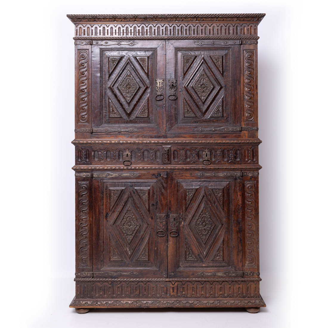 Em castanho com entalhamentos, de duas gavetas e quatros portas com losangos, ferragens em ferro, interior das portas com pinturas. Séc. XVII. Pequenas falhas, defeitos, restauros e vestígios xilófagos.