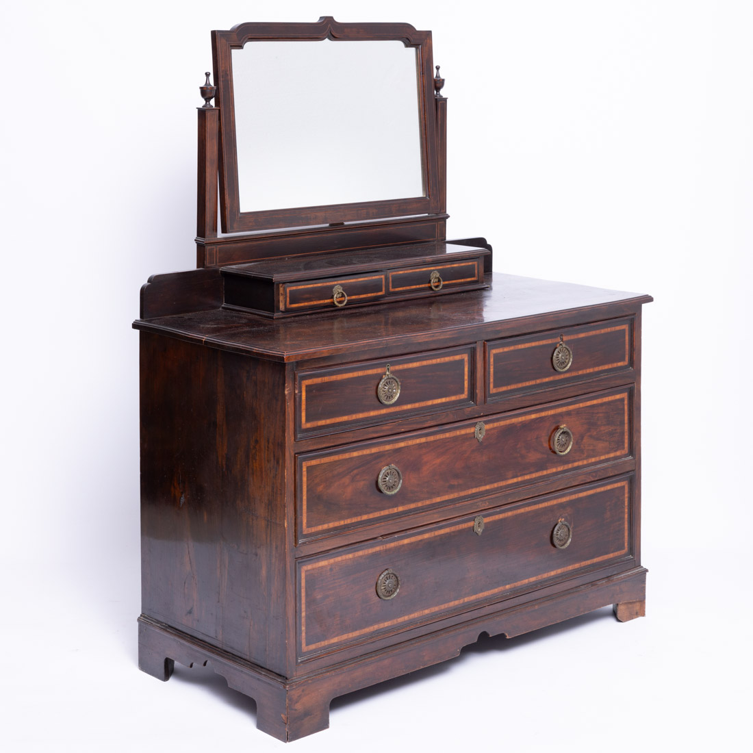 Estilo D. Maria, em madeira exótica com embutidos, de duas gavetões e duas gavetas, toucador de duas gavetas e espelho basculante. Pequenas falhas e defeitos.
