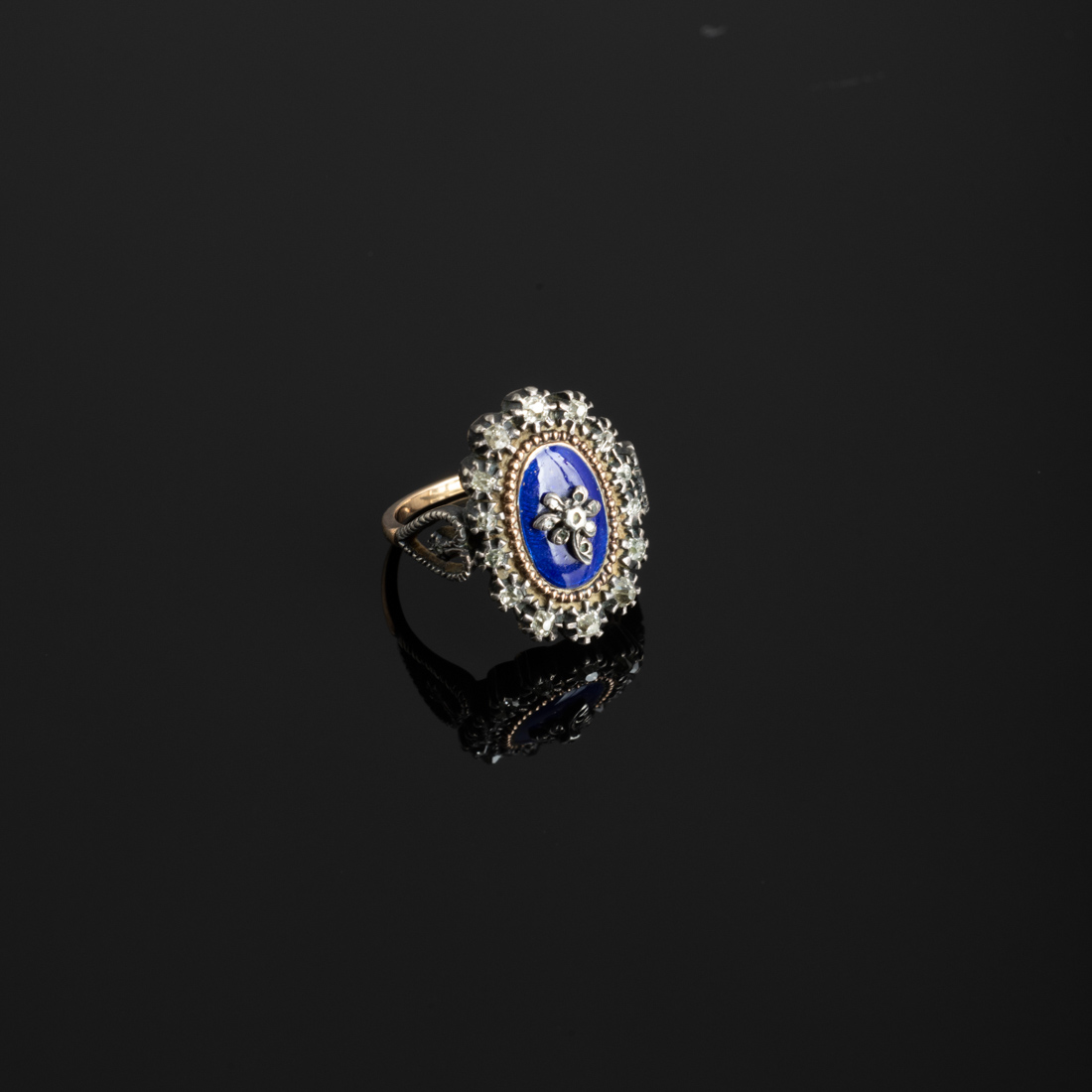 Em ouro e prata, cravejado com diamantes em talhe rosa, aplicação de esmalte azul. Sem marcas, ao abrigo do Decreto-Lei n.º 120/2017. Sinais de uso e pequena falha.