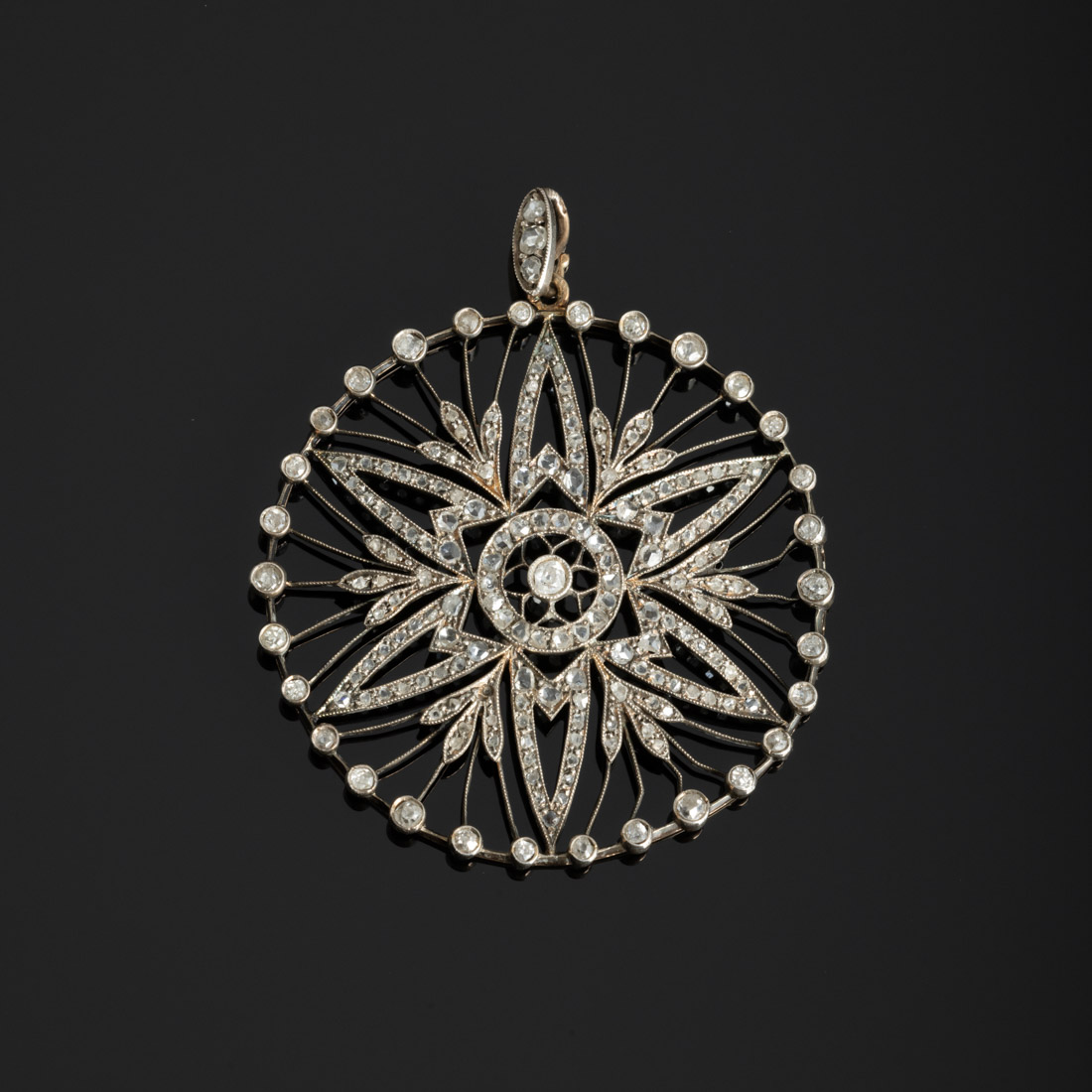 Em ouro português de 19.2Kt., contraste tigre (1887-1937) e prata cravejada com diamantes em talhe antigo de brilhante e rosa. Sinais de uso e ínfimos defeitos.