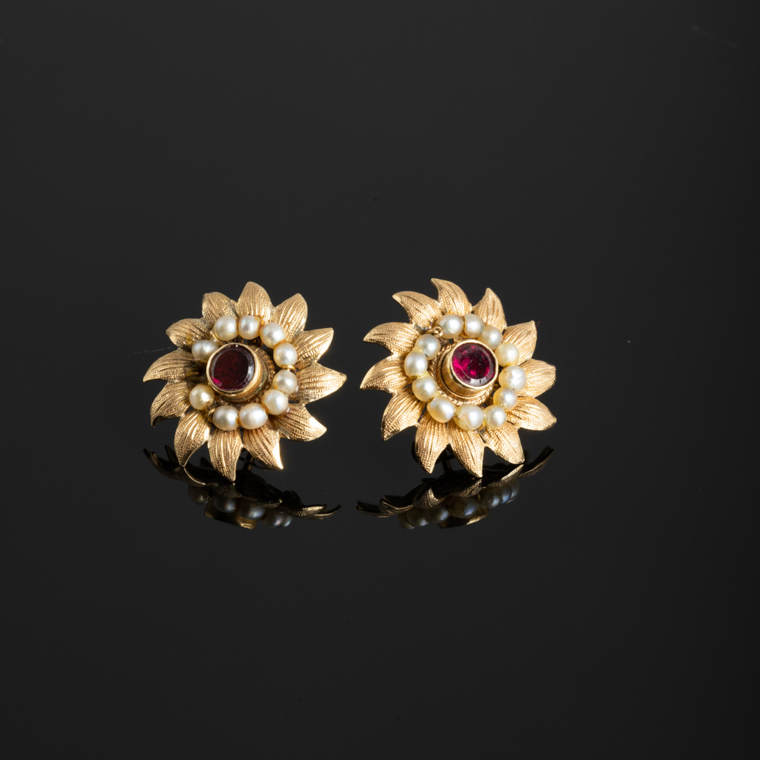 Em ouro cravejado com duas granadas em talhe redondo e pequenas pérolas de cultura (não testadas). Sinais de uso e falta uma pérola.