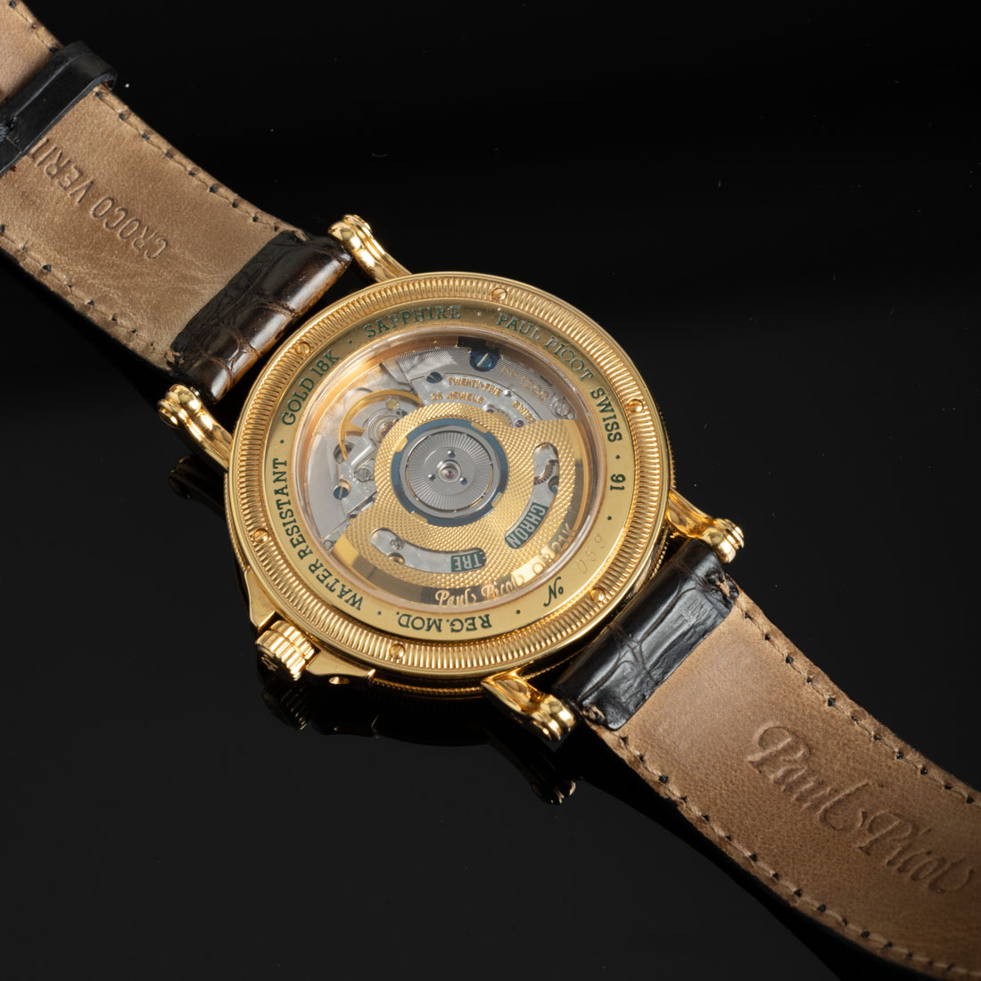 Suíço. Caixa em ouro de 18K, mostrador branco com numeração romana, bracelete original em pele com fivela em ouro de 18K. Movimento automático. Edição limitada nº 059. Em marcha. Com caixa e documentos originais. Sinais de uso. Peso total aprox.: 90,99 g.Dim.: 4 cm.