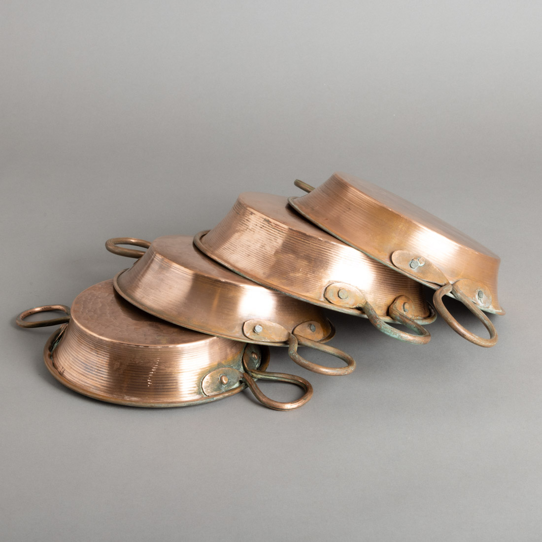 Em cobre, com duas pegas, de tamanhos decrescentes. Sinais de uso e algumas com oxidações.