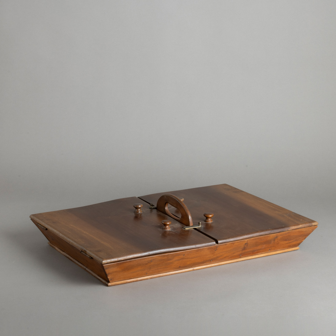 Em diferentes madeiras, puxadores torneados, ferragens em metal amarelo. Sinais de uso e vestígios xilófagos.