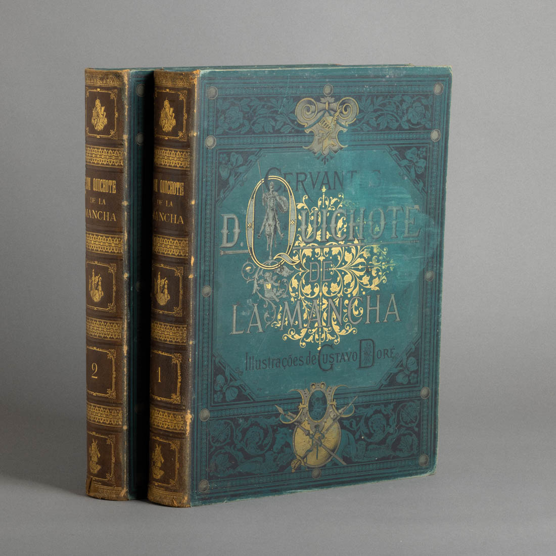 Obra em dois volumes de Miguel de Cervantes Saavedra, traduzida por Viscondes de Castilho e Azevedo, Pinheiro Chagas, desenhos de Gustavo Doré. Porto, 1876. Impressa da Companhia literária. Sinais de uso e de humidade.