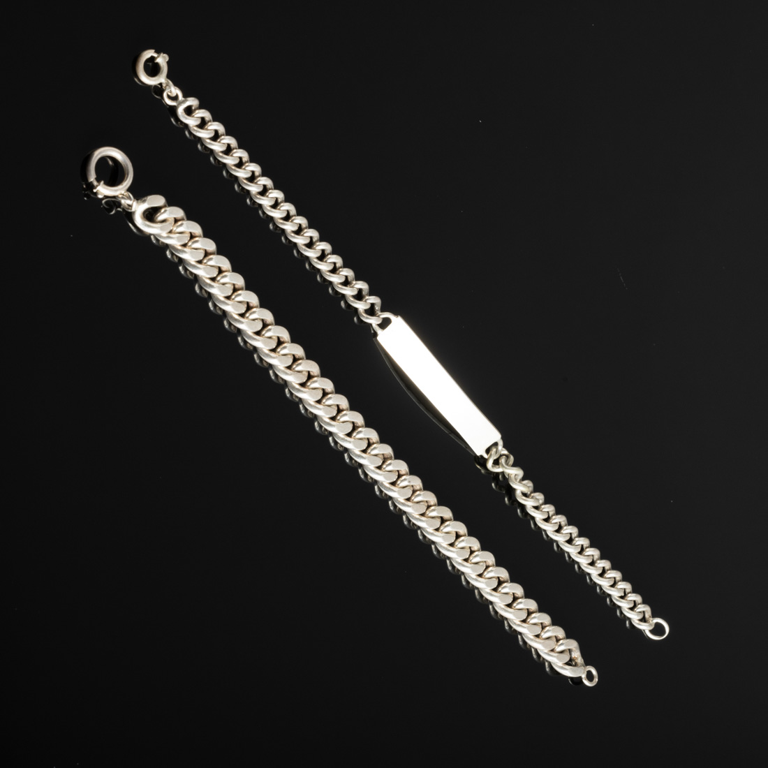 Em prata portuguesa contraste águia (1938-1984) de 833 e (pós 1985) de 835, em malha de barbela, uma com nome gravado. Sinais de uso.