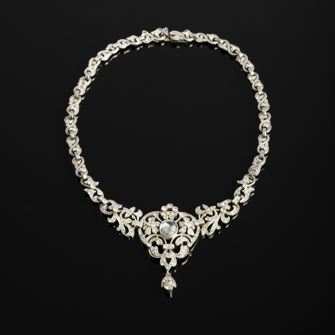 Em prata marcas não identificadas, cravejado com vidros e água marinha. Sem marcas, ao abrigo do Decreto-Lei n.º 120/2017. Sinais de uso.