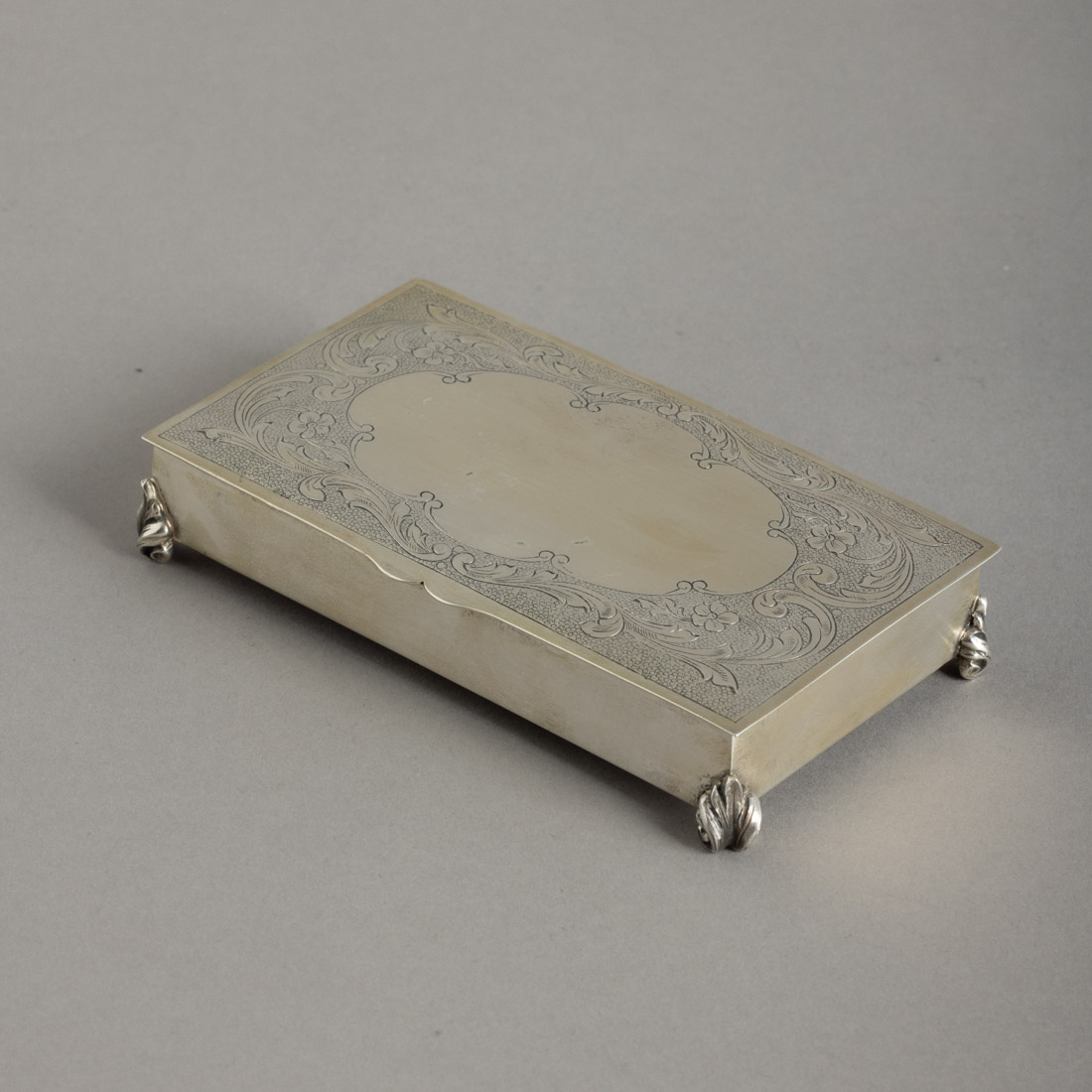 Em prata portuguesa contraste águia (pós 1985) de 835. decoração gravada "flores e elementos vegetalistas", interior dourado, dedicatória gravada no verso. Sinais de uso.