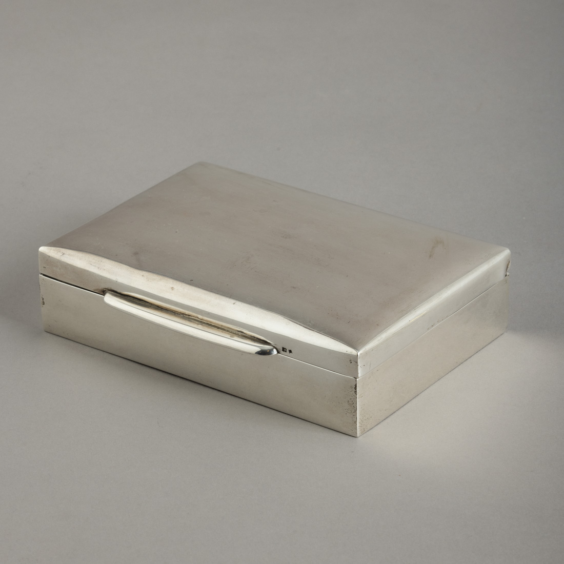 Em prata portuguesa contraste águia (pós 1985) de 925, decoração lisa, interior revestido a madeira. Sinais de uso e pequenas amolgadelas.