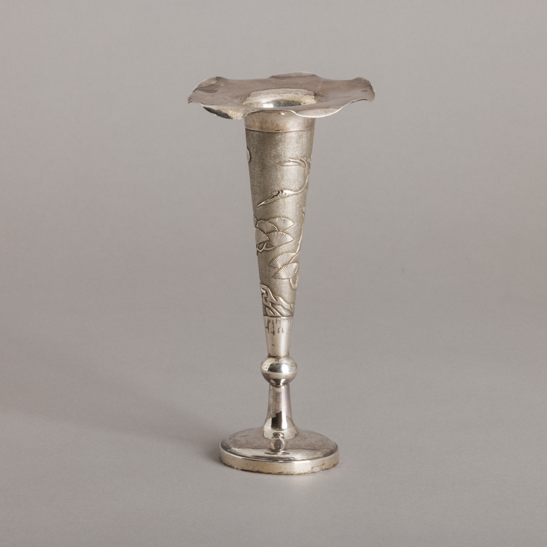 Em prata chinesa, marca com desgaste, decoração relevada "arvoredo e pássaro", bordo ondulado. Sem marcas portuguesas, ao abrigo do Decreto-Lei n.º 120/2017. Sinais de uso.