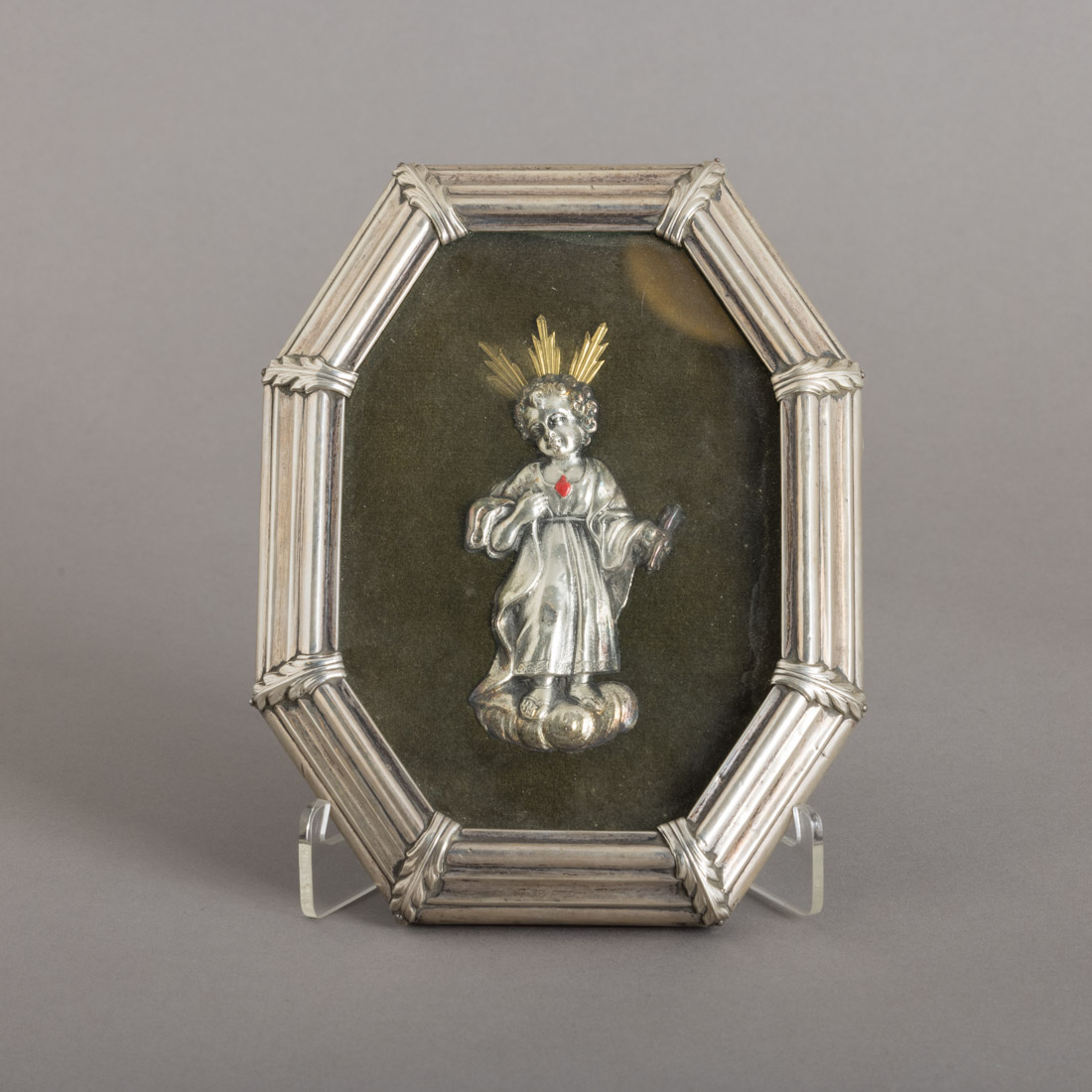 Moldura e imagem em prata, decoração relevada. Sem marcas, ao abrigo do Decreto-Lei n.º 120/2017. Sinais de uso e pequenas amolgadelas.