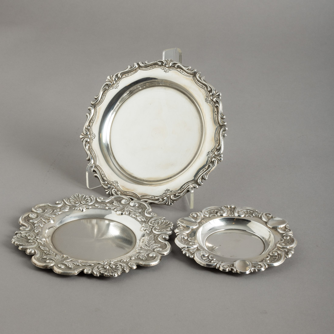 Em prata portuguesa contraste águia (1938-1984) de 833 e (pós 1985) de 835, decoração relevada e gravada "elementos vegetalistas, enrolamentos e concheados", uma com dedicatória gravada no verso. Sinais de uso. Peso aprox.: 175 g. Dim.: 12, 15,5 e 16 cm.