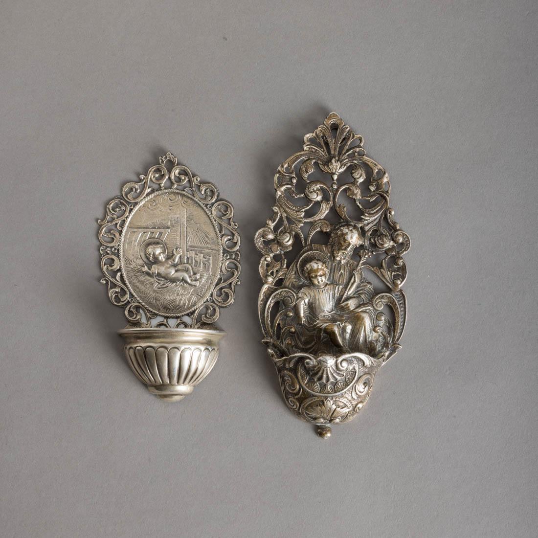 Em prata, uma espanhola de 915 marcas de garantia de teor (pós 1934), outra com marcas ilegíveis, decoração relevada e vazada. Sem marcas, ao abrigo do Decreto-Lei n.º 120/2017. sinais de uso e leve amolgadela.