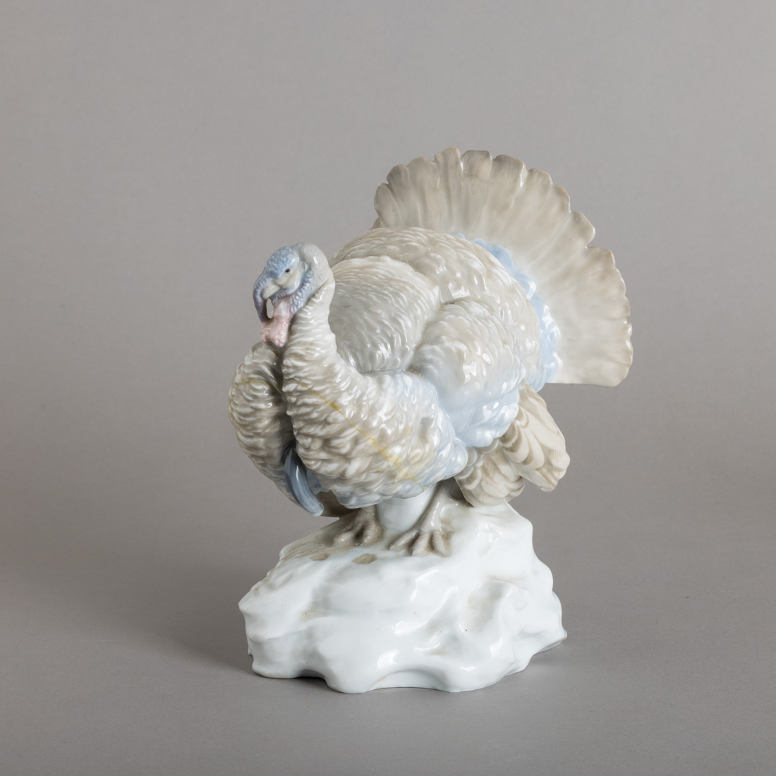 Escultura em porcelana moldada, decoração policromada. Europeia, marcada. Sinais de uso e esbeiçadelas.