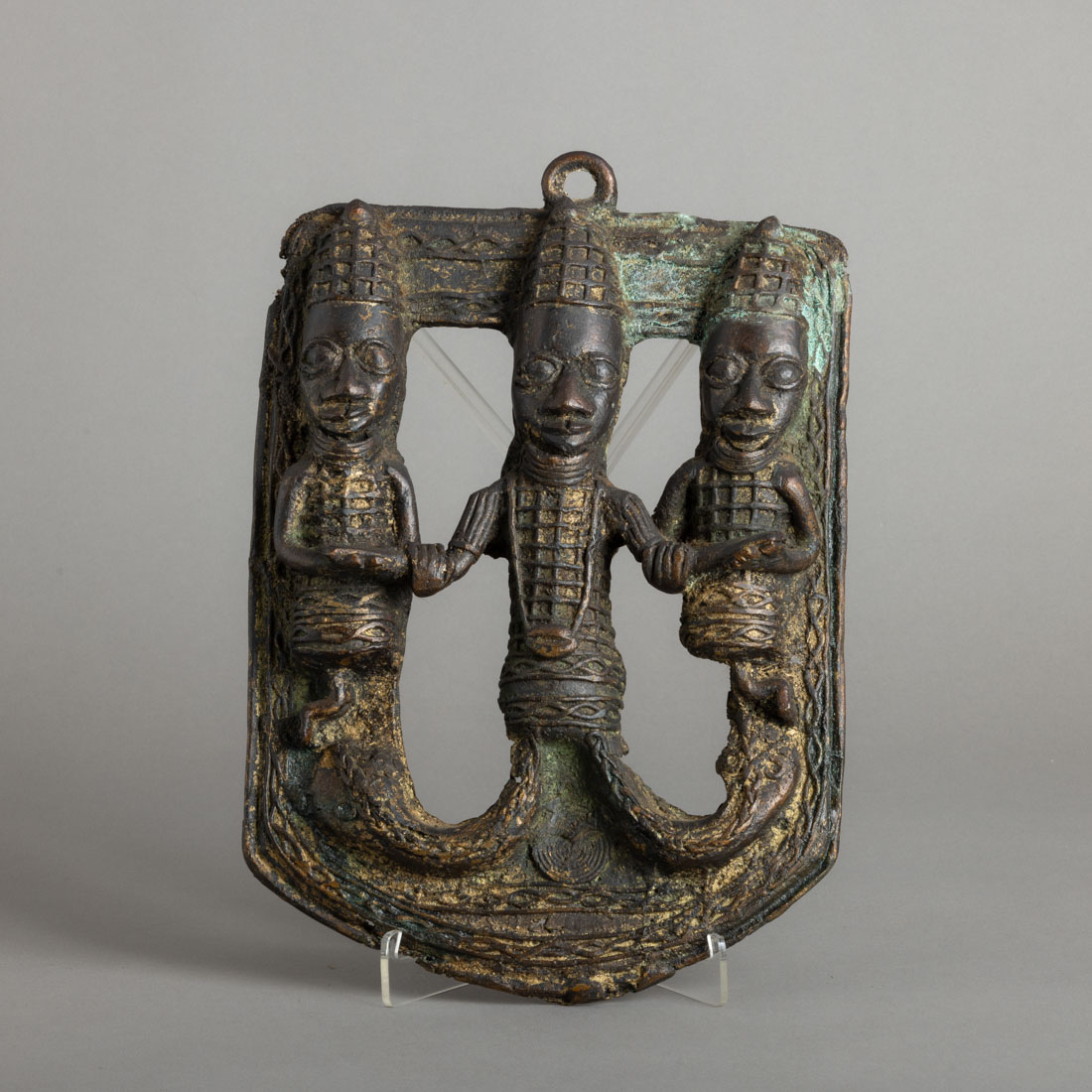Em bronze relevado e vazado representando Oba rodeado por dois assistentes. Africa. Sinais de uso e falhas.