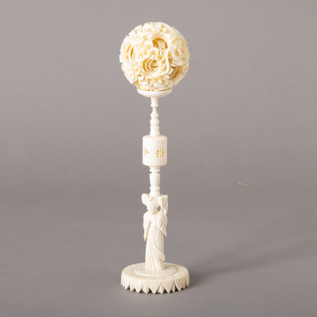 Esculpida em marfim, decoração relevada e vazada com dragões e elementos vegetalistas, fuste com figura feminina. China, Séc. XX Sinais de uso e ínfimas falhas.