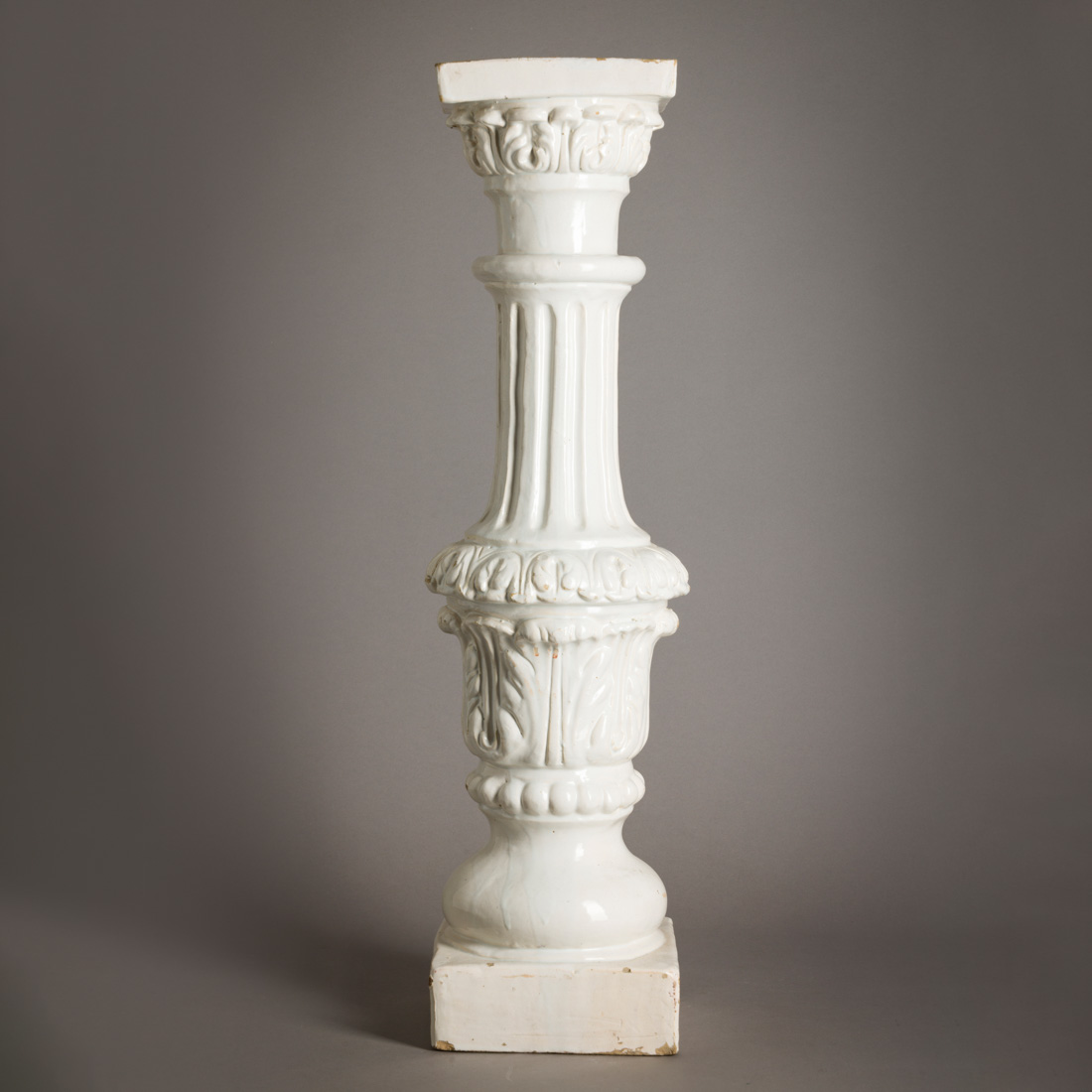 Em faiança, decoração relevada monocromada a branco com elementos vegetalistas. Desgaste no vidrado e pequenas esbeiçadelas.