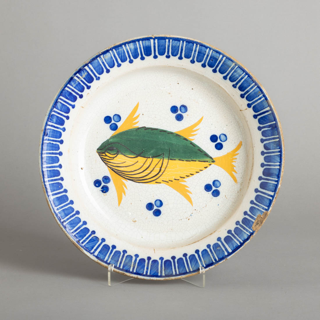 Em faiança portuguesa, decoração policromada "peixe". Séc. XIX/XX. Desgaste no vidrado, craquelê e esbeiçadelas.