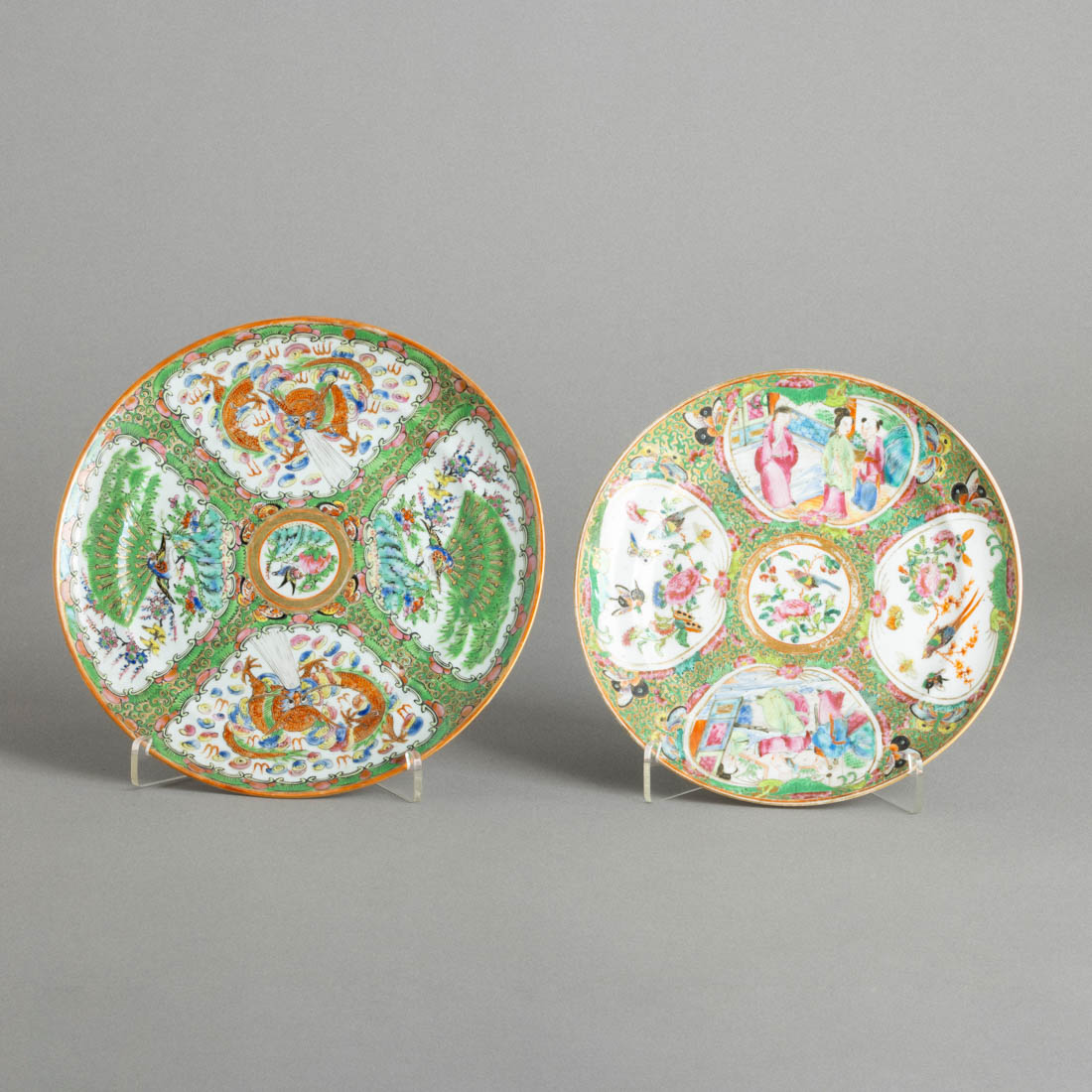 Em porcelana da China, Séc. XIX/XX decoração policromada e dourada, reservas com flores, pássaros, dragões e insectos, um "Mandarim". Sinais de uso, um com aba colada e outro com pequenos cabelos.