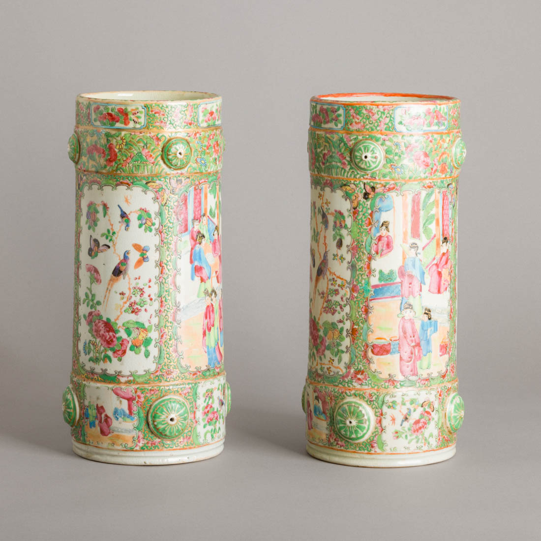 Em porcelana da China, Séc. XIX/XX decoração relevada, policromada e dourada "Mandarim", reservas com cena do quotidiano, flores e insectos. Restauros, craquelê e uma com cabelos.